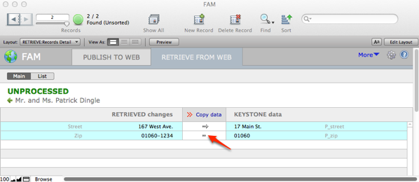 - If you want to accept some changes but not others, click on the Copy Data arrow in the row that has data you do not want to change. The arrowhead will disappear, indicating that this row should NOT be copied into your database.