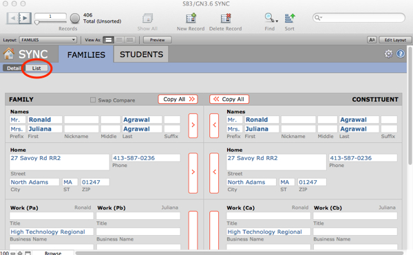 The Sync interface opens; it includes all records from the current Families file.