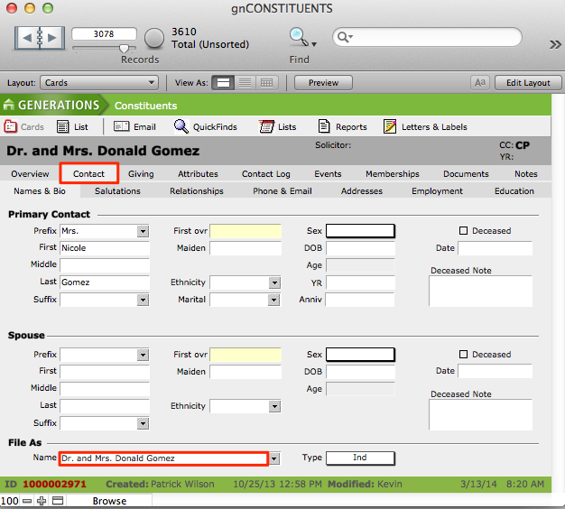 - Navigate to the Contact tab > Names & Bio subtab.