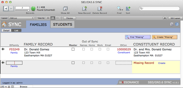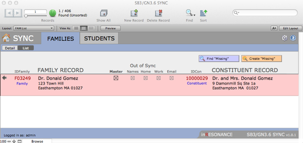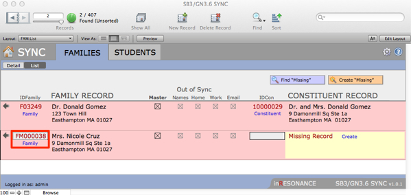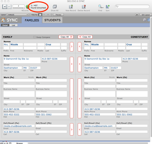 - Perform a find for the divorced family. In this case, we can see that the Sync file has one SANDBOX record (displayed on the left) that now has data for only one of the parents, and GENERATIONS (on the right) still has the two parents combined in one record.