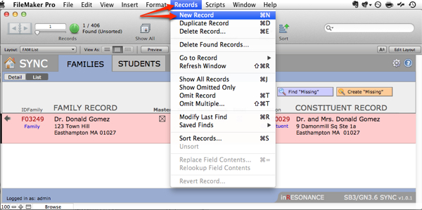 - Still in list view, select New Record from the FMP Records menu. This creates a new record within the Sync file.