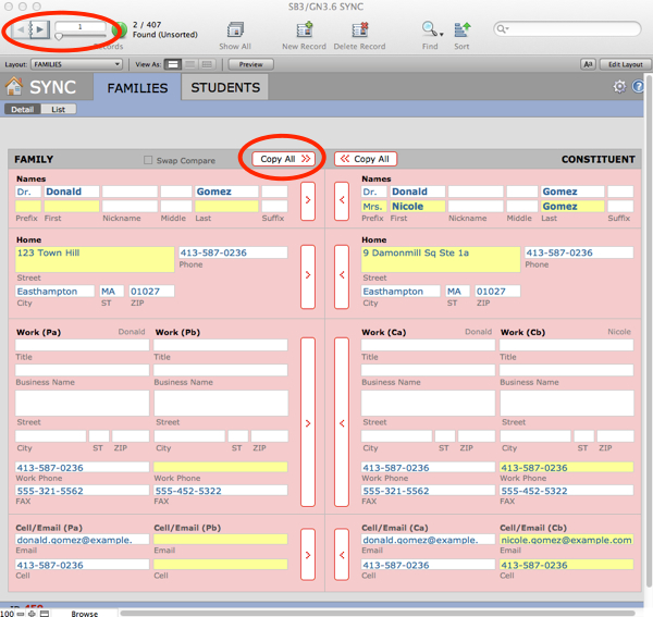 - Use the book in the top task area to navigate to the other record. Data that is not in sync will be highlighted in pink. Click Copy All to move all the data from SANDBOX into GENERATIONS for this record.