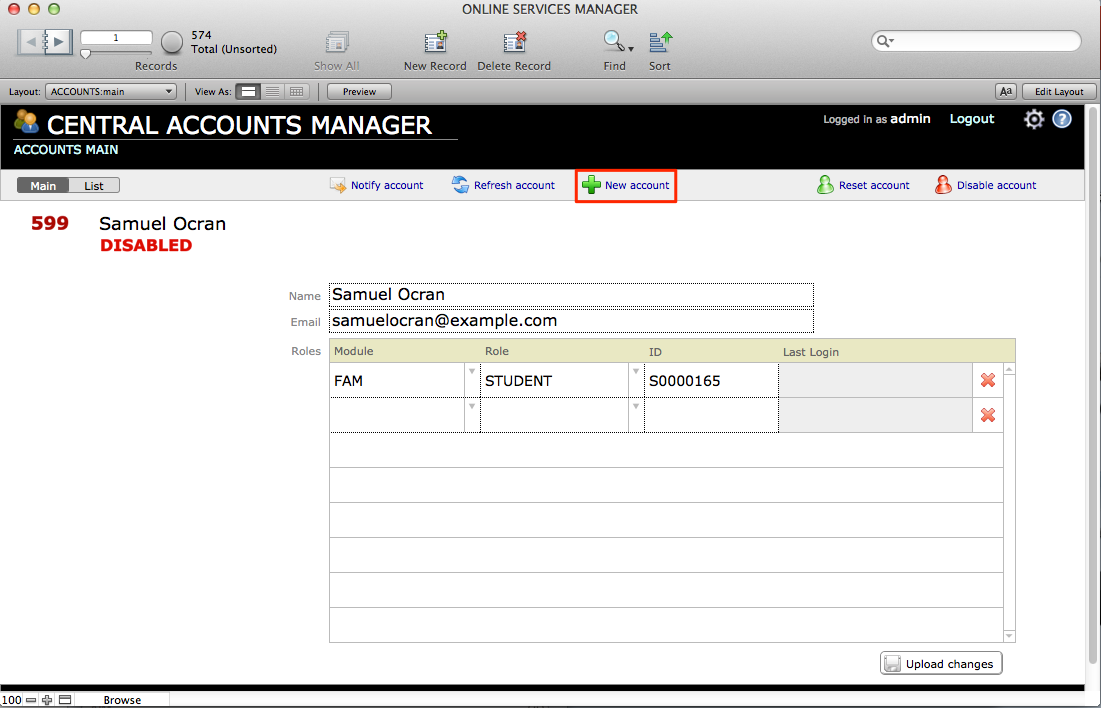 - In the account, click in the Module box, and select FAM. Then click in the Role box, and select STAFF. You will leave the ID box blank.