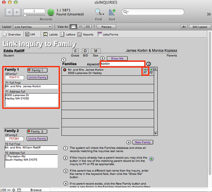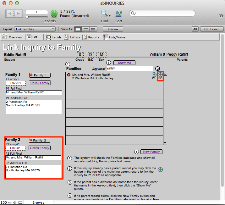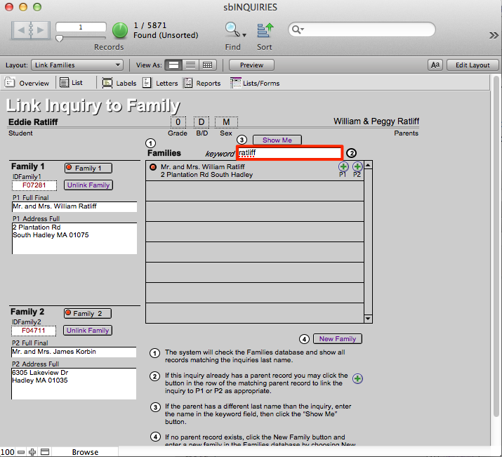 - Find the family that had been Family2 but should be Family1 by entering their last name where it says Keyword. Click Show Me.