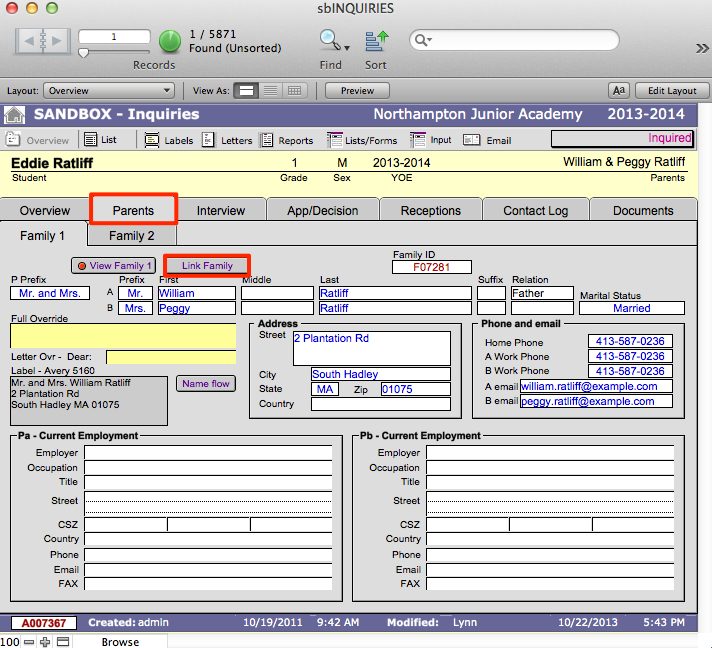 In SANDBOX, Family1 is understood to be the custodial family, with whom the child resides, and whose address is the child’s primary address. To swap Family1 and Family2, start in sbINQUIRIES. The process will be to unlink both families and then relink them in the proper relationships.