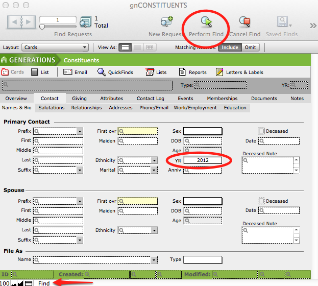 - Find the students who have been graduated by navigating to Constituents > Contact> Names & Bio tab, enter the year of Graduation in the YR field, and Perform Find.