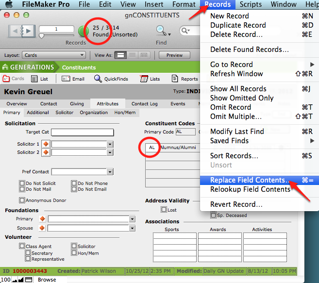 - With your cursor still inside the Constituent Code field, select the Records menu > Replace Field Contents.