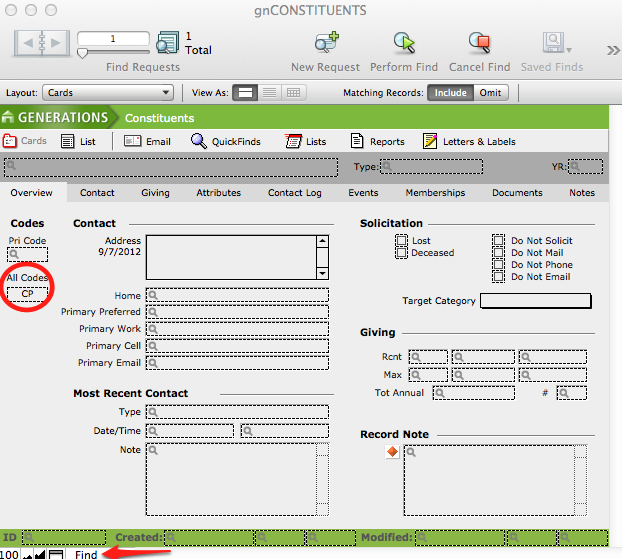 - From Constituents > Overview screen, use the All Codes field to Find CPs.