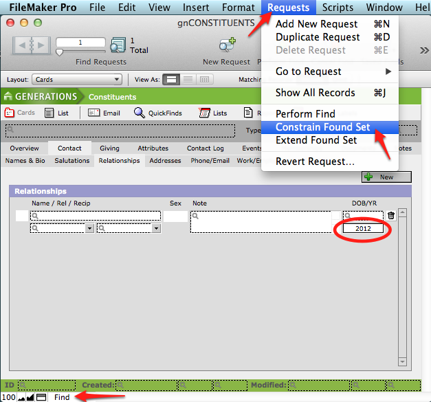 - Navigate to Contact > Relationships tab, enter Find mode, type in the year of graduation (YR), and then go to Requests menu > Constrain Found Set. This results in CPs who have a relationship to this particular graduating class.