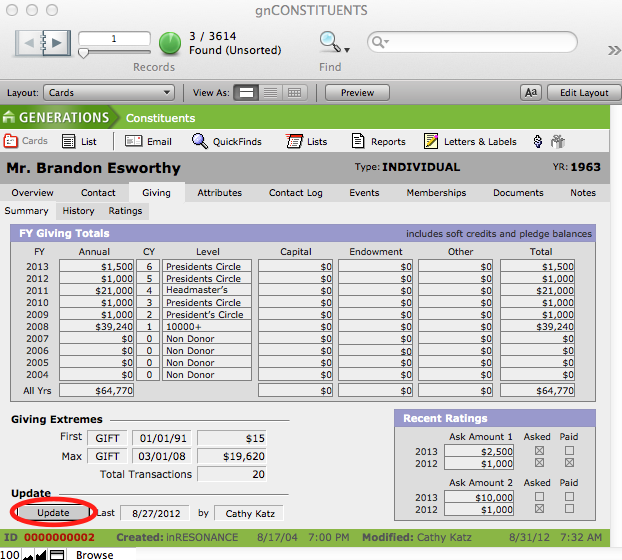 - From the Giving > Summary screen in Constituents—A single record can be updated or a found set of records by clicking the update button. You will be asked whether you want to update a single record or a found set.