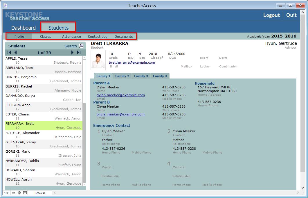 Students allows you to view biographical information for each of your students and advisees, see what classes they are enrolled in for the current term, view attendance incidents, and record contacts made with them. Students is divided into four sub tabs: Profile, Classes, Attendance, and Contact Log to help make managing students easier for you.