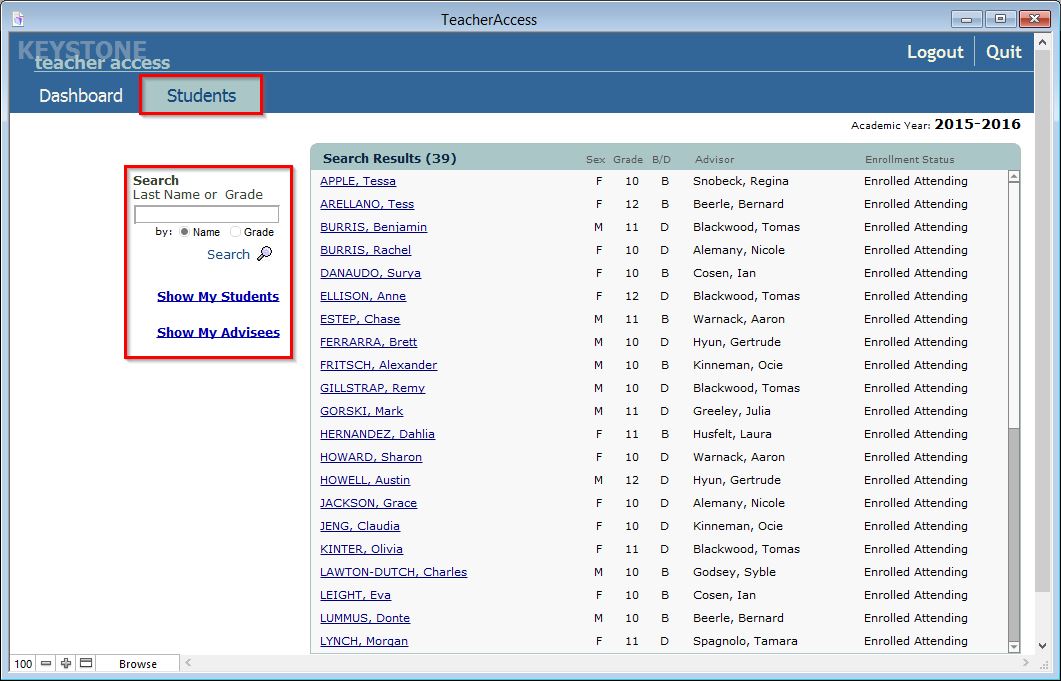 When you first click the Students tab you are presented with a screen that allows you to search for individual students by name or grade. Additionally, you can view a list of all the students you teach for the current term or all of your advisees.