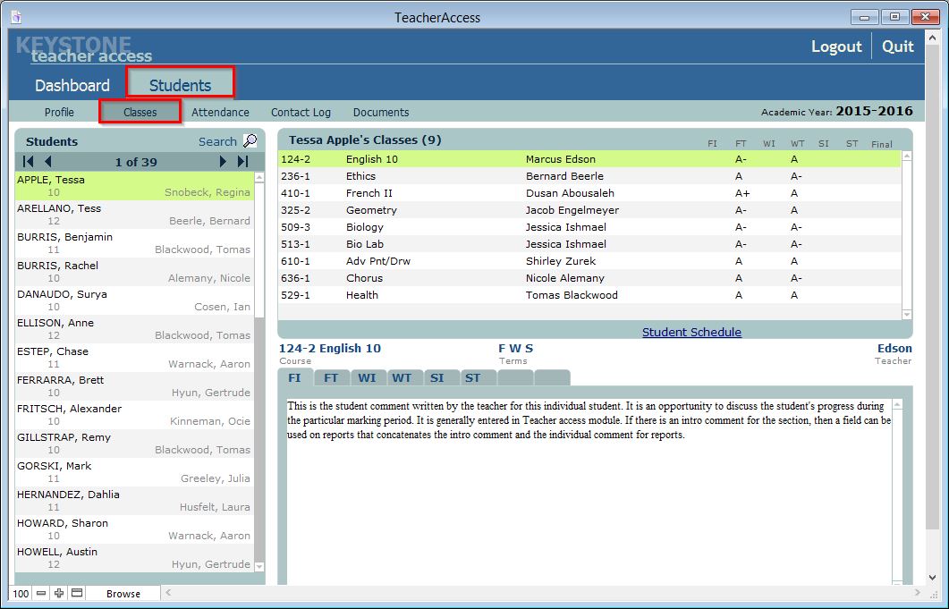- To view a specific student’s grade and comment information, click the Classes sub tab.